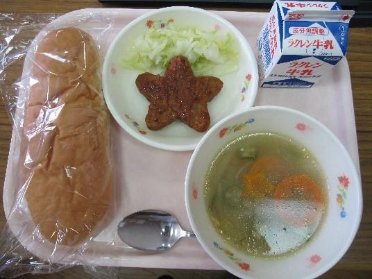 七夕メニュー 今日の献立は牛乳、コッペパン、トウモロコシのスープ、星のハンバーグ、キャベツのソテーでした。パッと目を引く星形のハンバーグがとてもかわいら…