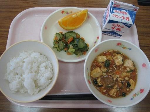 熱々の給食 給食が始まりました。柚木小学校で作られた給食が柚木中学校に届くことになっています。記念すべき1回目は、「ごはん、麻婆豆腐、中華和え、オレン…