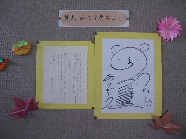 サイン 10月に講演に来てくださった熊丸みつ子先生から生徒一人一人にサインをいただきました。コピーではなく、一枚一枚手書きです。柚木中学校の子ども…