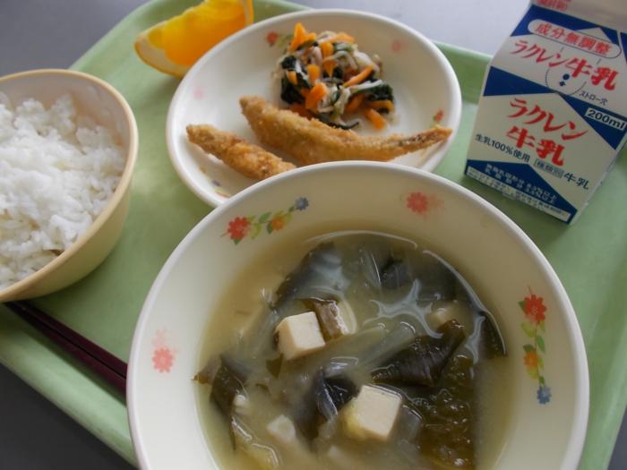 7/12(金)今日の給食 牛乳 ごはん みそ汁 甘酢和あえ 子持ちししゃもフライ オレンジ