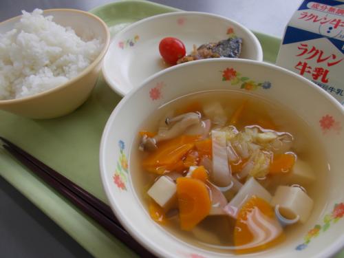 5/28(火)今日の給食 牛乳 ごはん 野菜わん さばの煮つけ ミニトマト