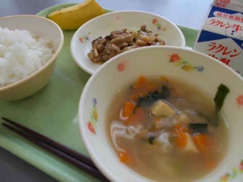 5/29(水)今日の給食 牛乳 ごはん 中華スープ チンジャオロースー バナナ