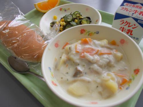 4/30(木)今日の給食 牛乳 コッペパン ごぼうのポタージュ ひじきサラダ オレンジ