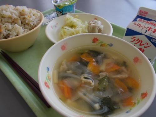 6/4(火)今日の給食 牛乳 小魚チャーハン 高野豆腐のスープ 肉シュウマイ 甘酢キャベツ ヨーグルト