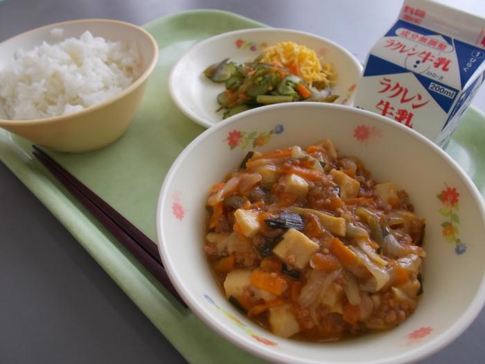 6/5(水)今日の給食 牛乳 ごはん マーボー豆腐 茎わかめの酢の物 【別配缶はいかん】錦糸卵