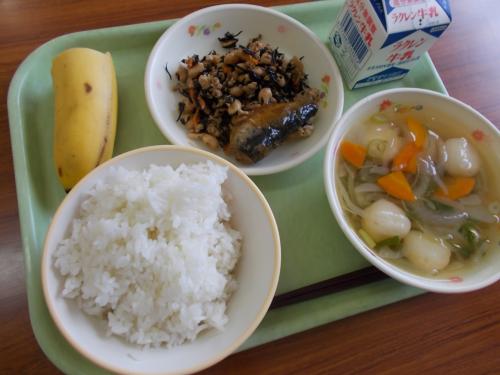 6/7(金)今日の給食 牛乳 ごはん つみれ汁 いわし生姜煮 大豆だいずとひじきの炒り煮 バナナ