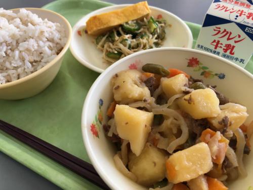 4/24(水)今日の給食 牛乳 麦ごはん 肉じゃが 厚焼たまご ごまあえ