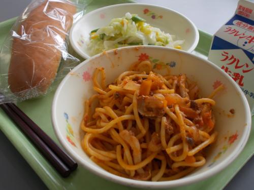 4/25(木)今日の給食 牛乳 コッペパン スパゲティミートソース 春野菜のサラダ