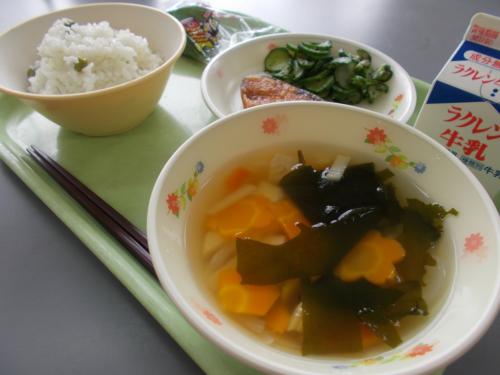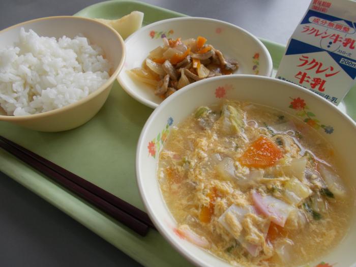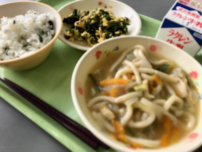 4/30(火)今日の給食 牛乳 わかめごはん(少なめ)五目うどん ほうれん草と卵の炒いため物