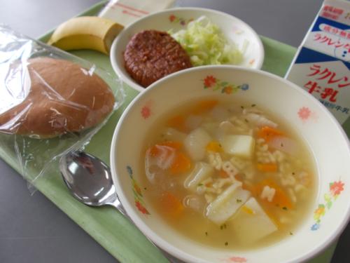5/2(木)今日の給食 牛乳 パーカーハウスパン ABCスープ 煮込みハンバーグ ゆでキャベツ バナナ