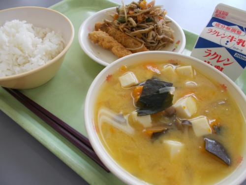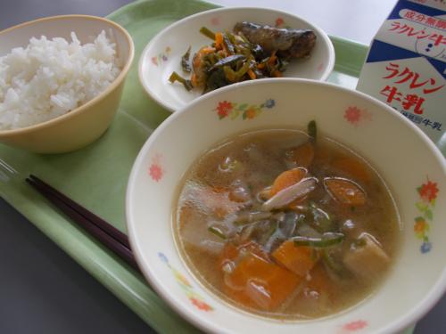 5/7(火)今日の給食 牛乳 ごはん りごぼう汁 いわし生姜煮 くきわかめの炒め煮