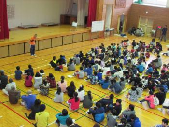 人権集会 今年の人権集会は、各学級の人権のちかいに加えて、「図書ボランティア」の方による朗読と「市民交響楽団」の方によるフルートとピアノの演奏で「あら…