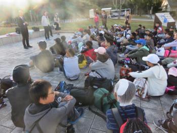 朝の出発式では、校長先生の話、児童代表の挨拶、添乗…