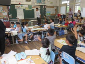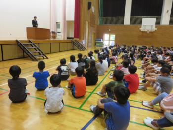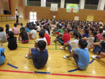 全校朝会 猛暑が続く中、子どもたちは今日も元気に登校してきました。暑い学校で過ごすのも今日で一区切りとなり、明日から、子どもたちが楽しみにしている夏…