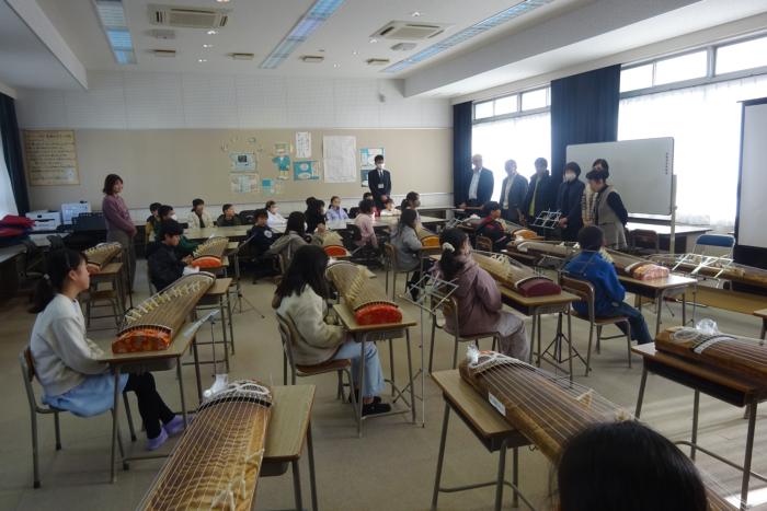 琴・尺八体験教室 4年生の2・3時間目は琴・尺八の体験教室でした。佐世保市三曲協会の方々にお越しいただきました。琴や尺八の歴史や種類などについてのお話をいただ…