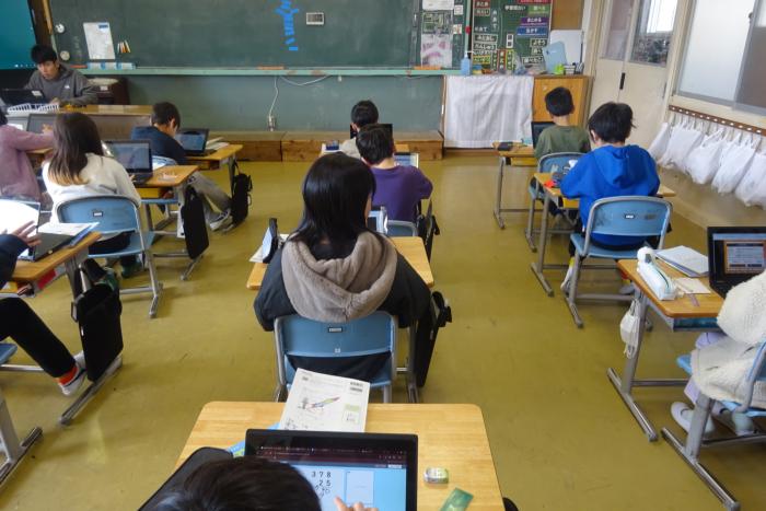 練習問題 3年生は、算数の時間に端末にインストールされているドリルプラネットの3けた×2けたの筆算の練習問題に取り組んでいました。3年生は端末を使う頻…