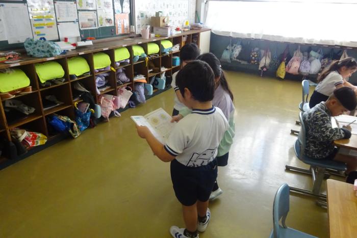 ふくしゅう 1年生は算数の復習問題にチャレンジしていました。「ちがいはいくつ」の文章問題の式と答えを書いて、友達同士で答えの確かめをしていました。落ち着…