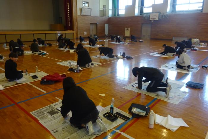 書き初め会 今日は全校での書き初め会の日でした。低・中・高学年ごとに低学年は教室で、中・高学年は体育館で実施しました。高学年は令和8年に大切にしたいこと…
