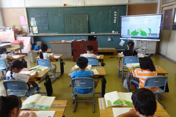 ノート指導 1年生は、国語の学習でした。学習していくことをノートに書く場面で、マス黒板を使って書き方の指導が行われていました。正しくそろえて丁寧に書く力…