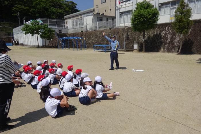 交通安全教室(1・2年生) 今日の3校時は、1・2年生の交通安全教室でした。佐世保警察署の方をお招きして、「いかのおすし」の確認や道路を歩くときに気を付けることなどのお…