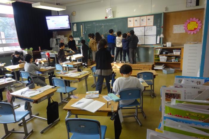 3年生は算数の学習をしていました。円の中心から円の周りに引いた直線の長さを調べていました。たくさんの線を引いて長さを図り、ひみつをつきとめて…