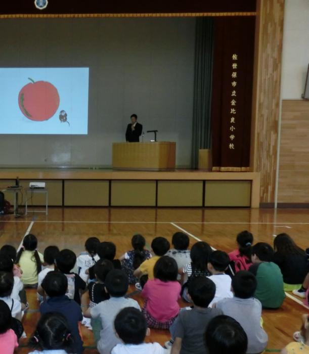 いのちを見つめる日 いのちを見つめる日を前に全校朝会で校長による講話と読み聞かせを行いました。絵本「サルのオズワルド」を通して、「命の輝き」、「みんな仲良くする…