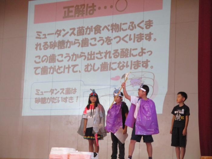 歯の集会 保健委員会の子どもたちがむし歯予防のためにお話やクイズをしました。