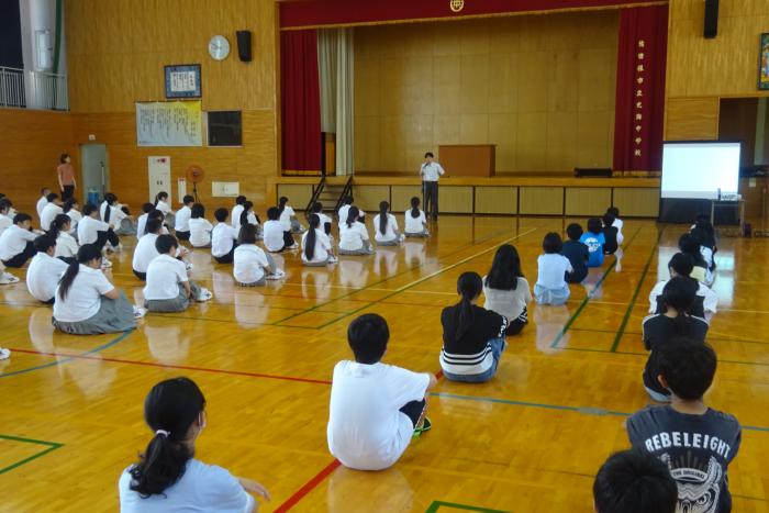対面式 6年生が中学校舎での第一歩を踏み出しました。今日は朝から光海中学校の体育館で6年生と中学生全校生徒による対面式が実施されました。両校長あいさ…