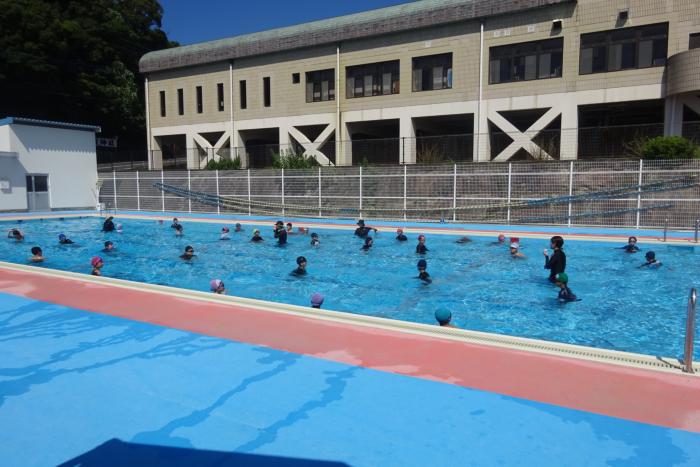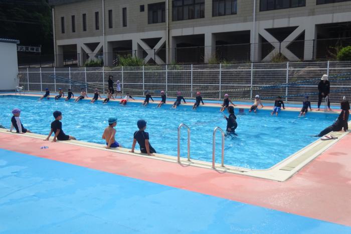 水泳の学習 今日の2校時は1年生が小プール、3・4年生が大プールでの水泳の学習でした。1年生は水遊びということで、顔を水に付けたり、だるま浮きを楽しんだ…