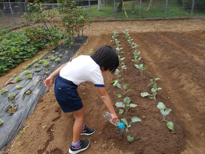 野菜のお世話 先週、1・2年生が冬野菜を植えました。