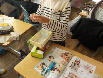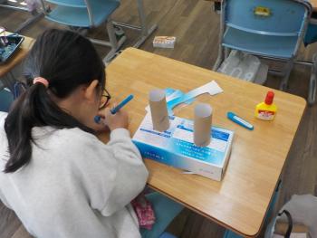 2年生が、図工に取り組んでいました。いろいろな箱や材料を使って、自分なりの友達ハウスを作ります。階段を作ったり、煙突のようなものを作ったりして楽しそうに工夫していました。