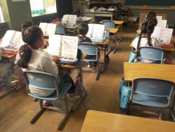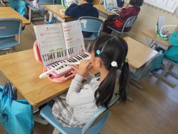 1年生が、鍵盤ハーモニカで演奏していました。これまで習った「なかよし」や「どんぐりさんのおうち」という曲を楽しそうに弾いていました。ド〜ソの場所を覚えて、スラスラと弾けるようになっていました。