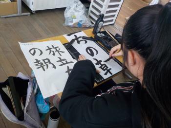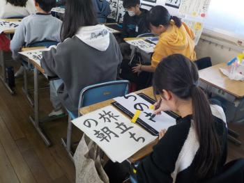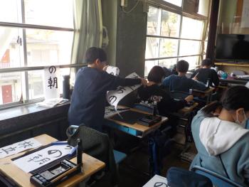 6年生が、書き初めに取り組んでいました。題は「旅立ちの朝」です。一字一字の特徴を感じ取りながら丁寧に書いていました。