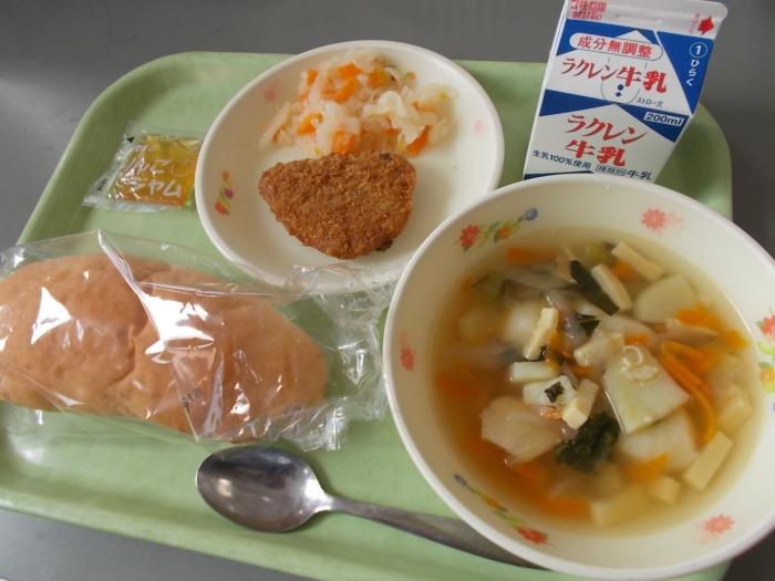 牛乳 コッペパン 高野豆腐のスープ かぼちゃ挽肉フライ ゆずドレッシングサラダ りんごジャム