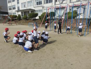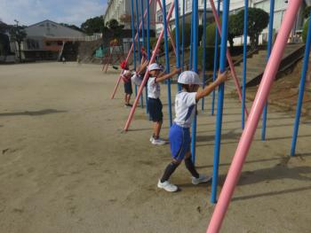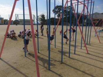 ぽかぽか陽気の中で気持ちの良い秋の空の下。2年生の子ども達は、体育の時間に楽しく活動しました。〇上り棒を使って、体つくりを行いました。