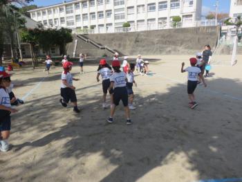 〇二本の上り棒を両手でもって、体を1回転させます。 〇腕で体を支えながら、足を上にあげその場で回転します。難しい運動でしたが、2年生の子ども達は頑張っていました。 〇次は、ドッチビーをしました。 〇今週火曜日は、授業参観があります。そのあと、親子レクレーションがあり、親子でドッチビーをする予定です。その練習を行いました。 |