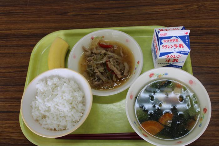 チンジャオロース 中華スープ バナナ 子ども向けなのかちょっぴり薄味だったけど、チンジャオロース、めちゃくちゃおいしかったです。