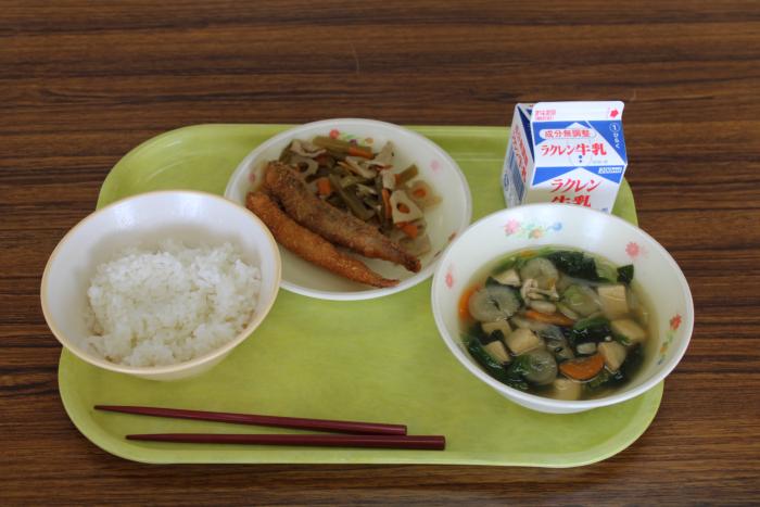 野菜わん ししゃも 茎わかめの炒め煮   野菜わんではたくさんの野菜をとることができ、茎わかめの炒め煮では普段あまり食べることのない茎わかめを食べ、そしてししゃもは頭からバリバリとい…