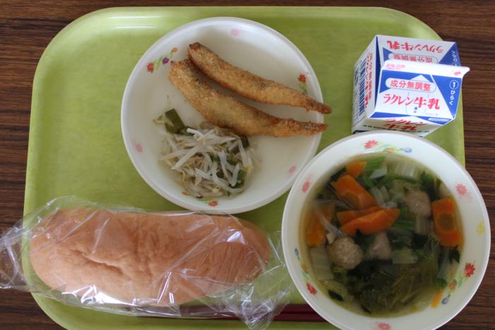 肉だんごのスープ ししゃもフライ もやしのソテー スープの中に入っていた肉団子。もっちり歯ごたえがあって、野菜のうまみがしみ込んでいてとてもおいしかったです。寒い日にあったかいスープは嬉しい…