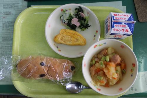 レーズンパン じゃが芋のウィンナー煮 オムレツ 野菜のソテー じゃが芋のウィンナー煮のじゃが芋が熱々ホクホクでした。子どもたちが食べる頃には少し冷めていたかも知れませんが、それでもじゃが芋のホクホク感は…