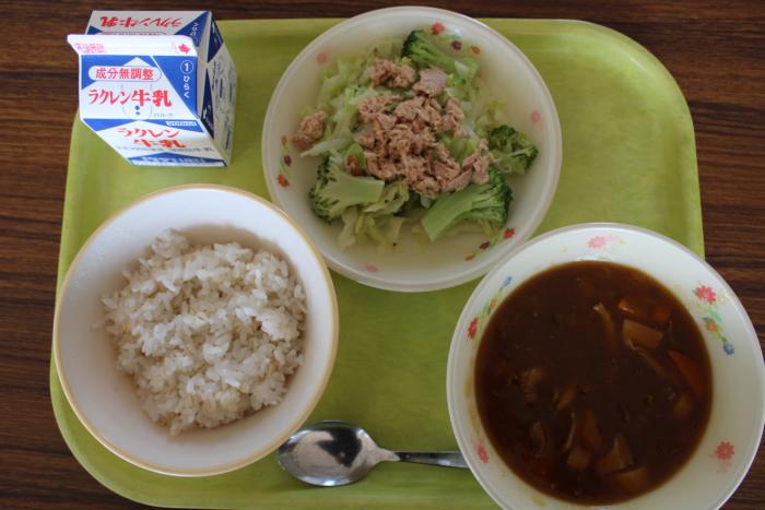 きのこカレー ツナサラダ 今日はみんな大好きカレーでした。