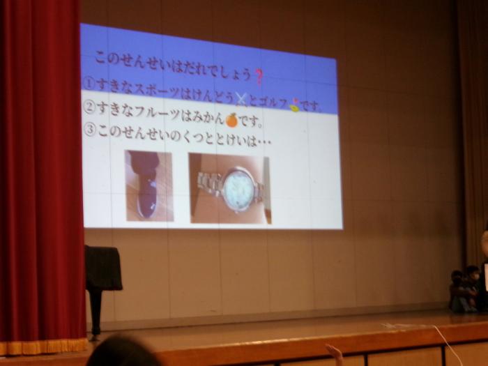 児童集会(スリーヒントクイズ) 今日は久しぶりの児童集会。担当は運営委員会です。今日の集会は3ヒントクイズ。関係がある3つのヒントから連想されるものを当てることです。