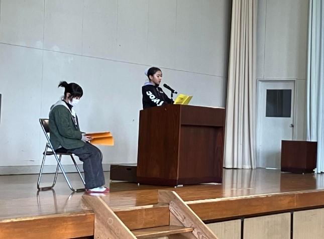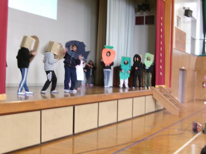 まごわやさしい(給食集会) 1月24日から30日までは全国学校給食週間です。学校給食の始まりは明治22年、山形の小学校から始まったと言われています。