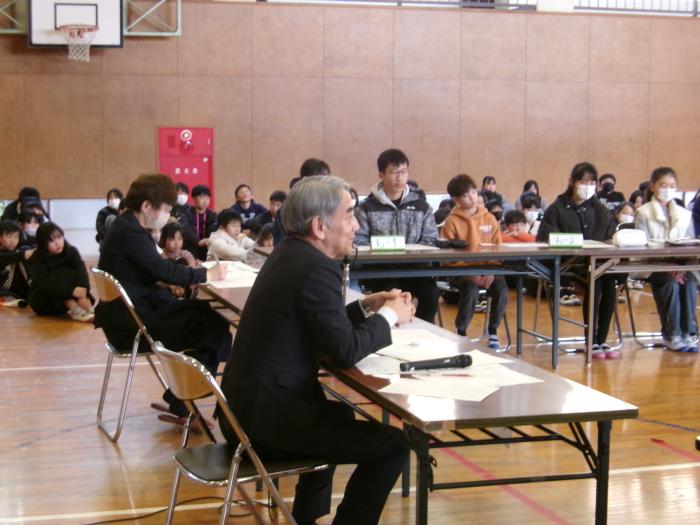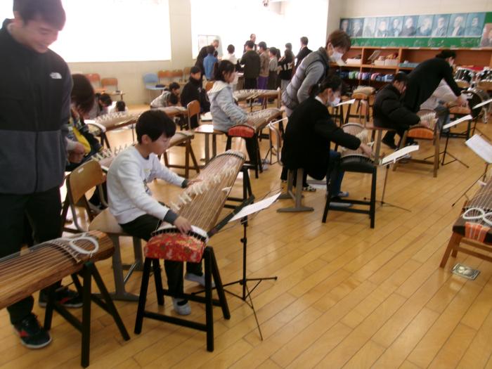 和楽器体験(4年) 4年生では市内の和楽器奏者を招いて琴や尺八の体験教室です。結構な数の琴と尺八を音楽室に持ち込んでくださっての演奏体験。なかなか音の出ない尺八…