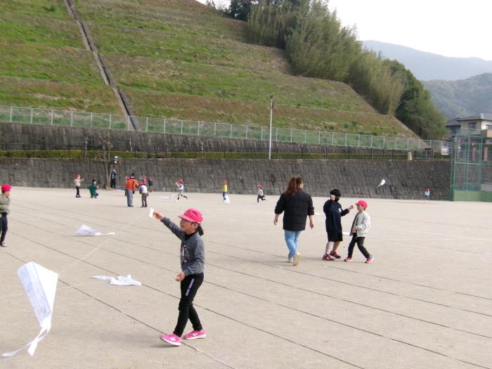 走って!走って!(1年生と6年生で凧揚げ) 今日はちょっと春めいたお天気。運動では1年生が作った凧をいっしょに揚げる6年生の姿が。1年生の生活科凧揚げのサポートを6年生がやってます。気…
