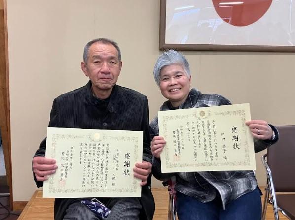 警察業務協力功労者の表彰(川口さん、陽光台自治会) 早岐警察署の警察業務協力功労者の表彰を登校見守りボランティアの川口昌子さんと陽光台自治会(会長鈴山進さん)が受賞されました。