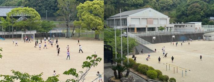 元気いっぱいに! 昼休み、江上小学校運動場には子供たちの元気な声が響いています。ドッジボールに鬼ごっこなど楽しそうに遊ぶ子供たちです。外で元気に遊ぶことも大切…