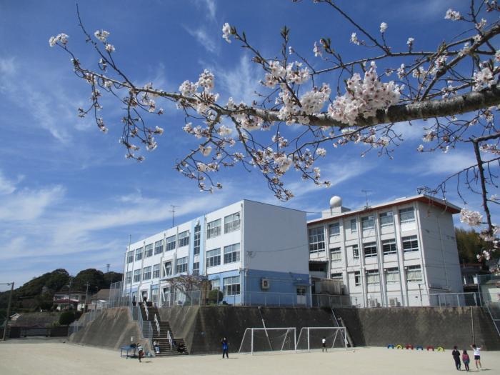 桜と校舎と先生がみんなを待ってるよ 春休み中も、船越小学校の運動場には遊びに来た子どもたちの笑顔と歓声が響いています。