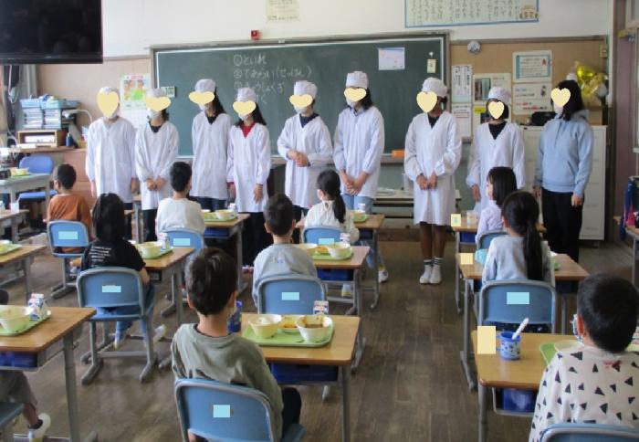 4校時終了後、6年生が1年生教室に来てくれ、1年生の配膳の準備をしてくれました。