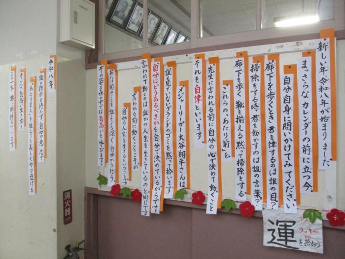 令和8年、始動!「自分から動くかっこよさ」を求めて 本日、令和8年の第3学期がスタートしました。 校長室前の掲示板には,